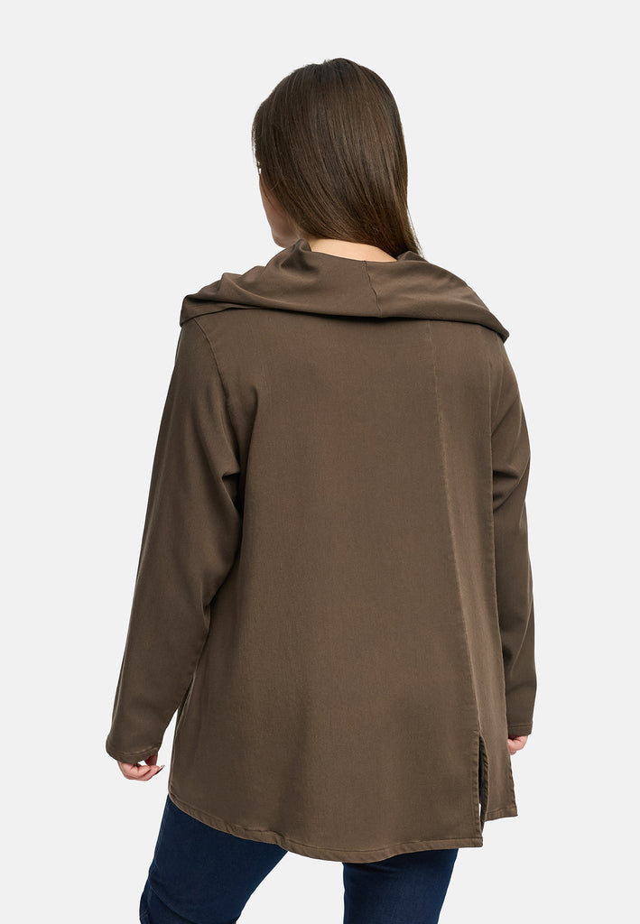 • Details: Breiter, weich fallender Schalkragen, Teilungsnaht vorn, kleiner Schlitz am vorderen Saum (hinten wieder aufgenommen), lange Ärmel